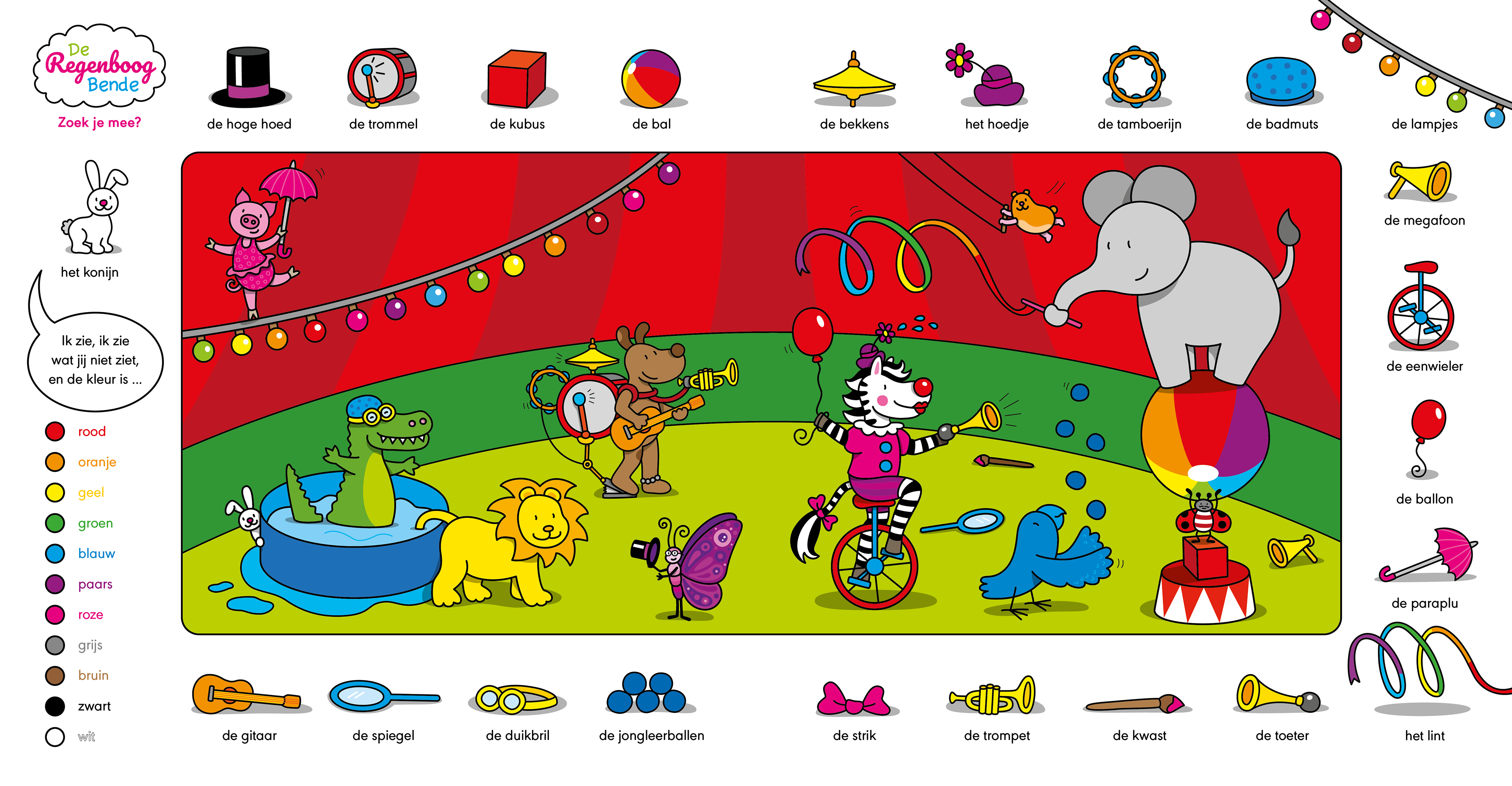 Hieronder vind je een paar spelletjes uit het boek van De Regenboog Bende in het circus. Op de zoekplaat kun je van alles zoeken en vinden. En kun jij net zo goed op één been staan, net als Varken? Voor meer spelletjes, kijk ook bij de andere boeken van de Regenboogbende!